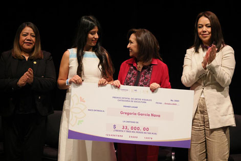 Y en la categoría de escultura, Gregoria García Nava, fue galardonada con el primer lugar por “La voz de las hijas de Tlaxcala: Raíces que florecen desde el corazón del maíz”. El segundo lugar fue para Daniel Delgado Herrera, con su obra “En la memoria del aguacate, lo ancestral era la utopía / Juego para dos personas”.