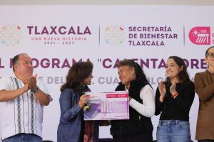 En la entrega simbólica a los beneficiarios de los municipios de Atlangatepec, Nanacamilpa, San José Teacalco, San Pablo del Monte y Cuaxomulco, la mandataria estatal estuvo acompañada de la secretaria de Bienestar estatal, María Estela Álvarez Corona; del secretario de Medio Ambiente, Pedro Aquino Alvarado; de la presidenta de la Mesa Directiva, Maribel León Cruz, y de la presidenta del Poder Judicial, Fanny Margarita Amador Montes, así como de alcaldes y beneficiarios del programa.